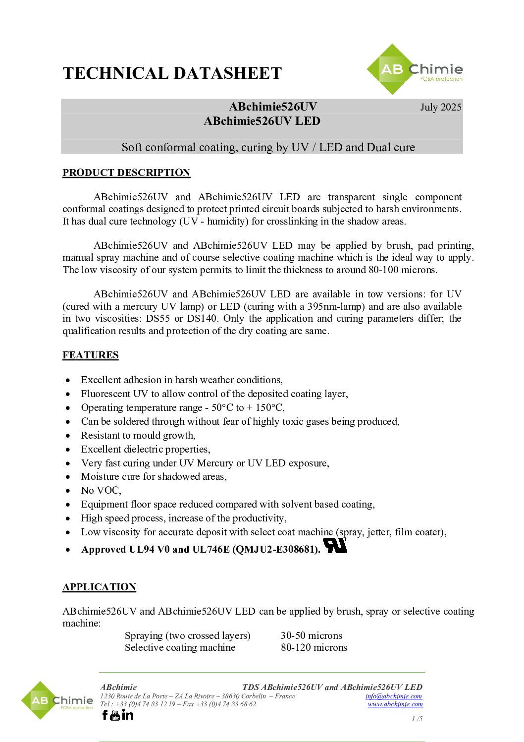 October 29, 2025 Brooklyn ABchimie 526UV DS55 MS Conformal Coating (UV -Dual cure) Download Tags: English