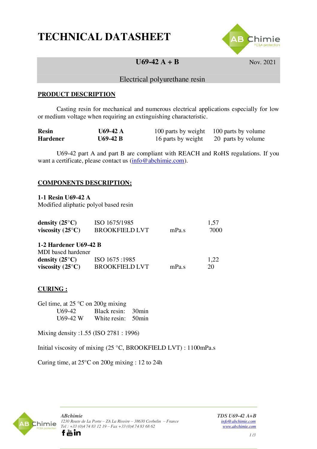 November 10, 2025 Brooklyn U69 42 (A+B) Electrical polyurethane resin Download Categories: Epoxy and PU Resins TDS Tags: English
