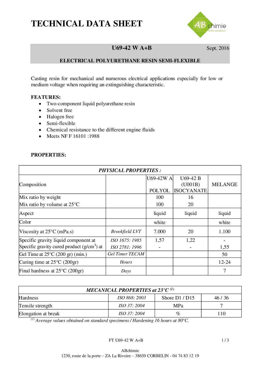 November 10, 2025 Brooklyn U69 42W (A+B) Electrical Polyurethane Resins Semi-Flexible Download Categories: Epoxy and PU Resins TDS Tags: English