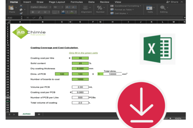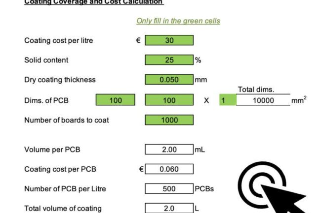 Simply enter your data into the green fields, and the tool will calculate the volume of coating needed per PCB, the cost per PCB, how many PCBs can be coated per liter, and the total volume required for your project.