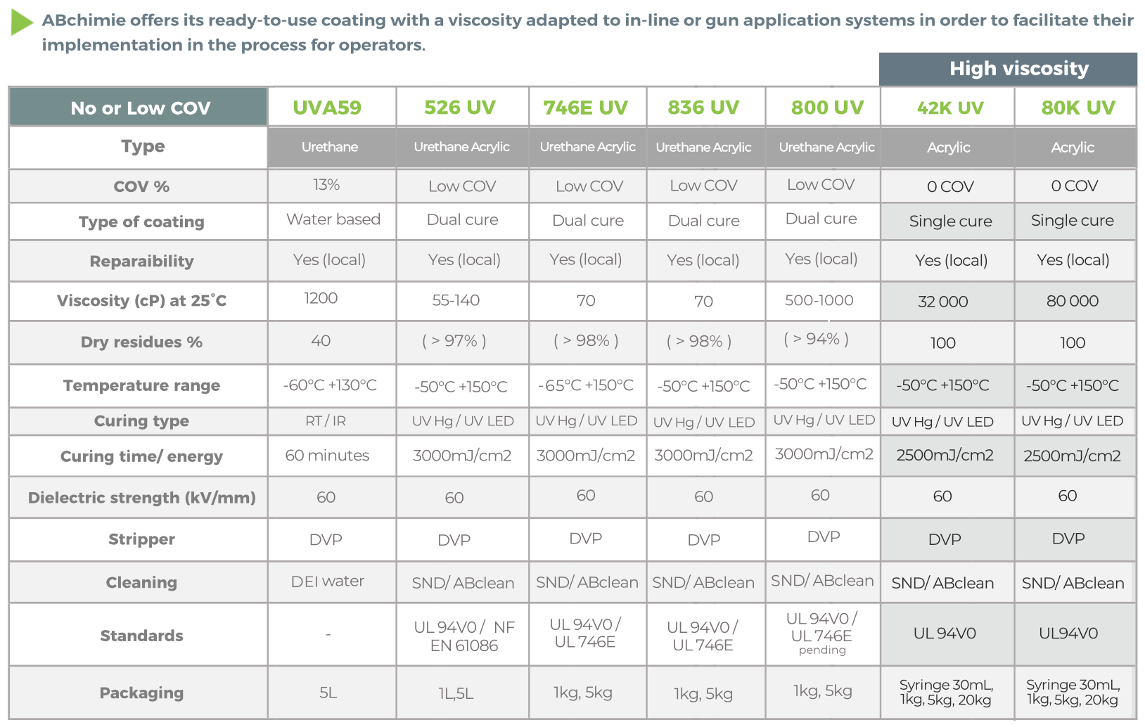 L’un de ces produits est AVR80 BA, un vernis de tropicalisation acrylique non toxique et écologique formulé avec un système de solvant plus sûr conçu pour protéger à la fois les utilisateurs et l’environnement. Il est devenu une solution de confiance dans les secteurs de l’automobile, de la défense et de l’industrie. Conformément à l’évolution vers les technologies de revêtement de nouvelle génération, nous proposons également ABchimie526 UV et ABchimie746 E UV. Ces formulations avancées sont sans COV et compatibles avec les systèmes de polymérisation UV au mercure et LED 395 nm, offrant une protection haute performance avec un impact environnemental réduit.