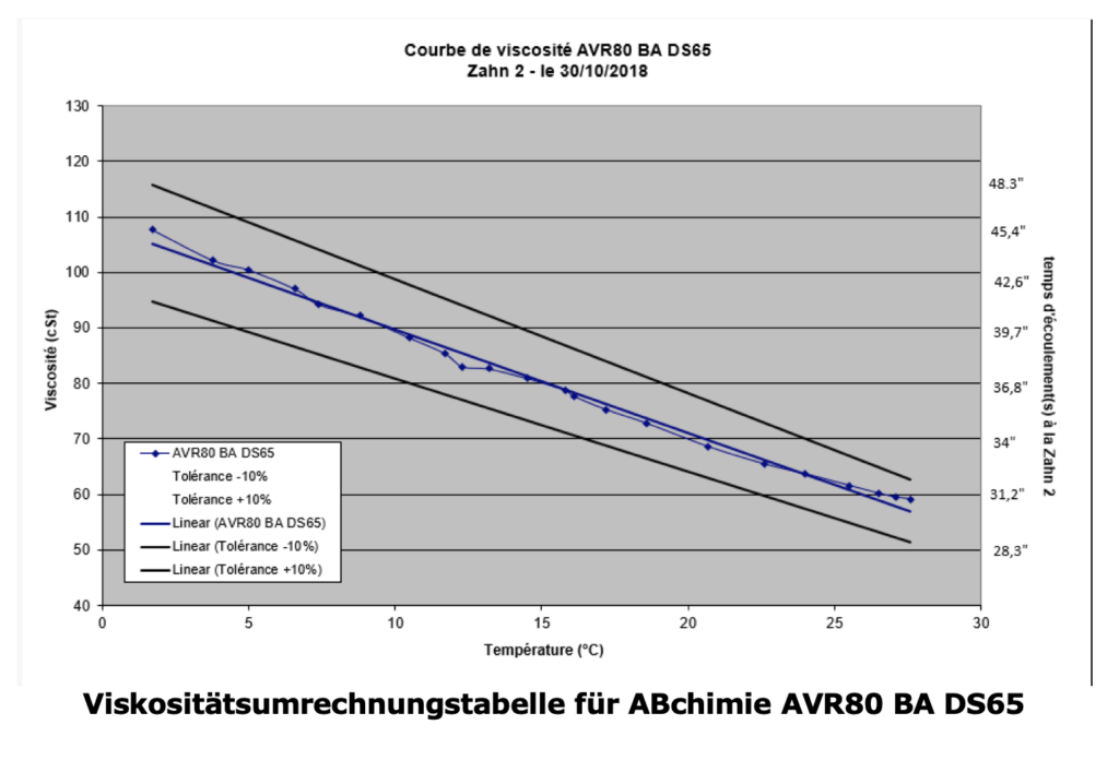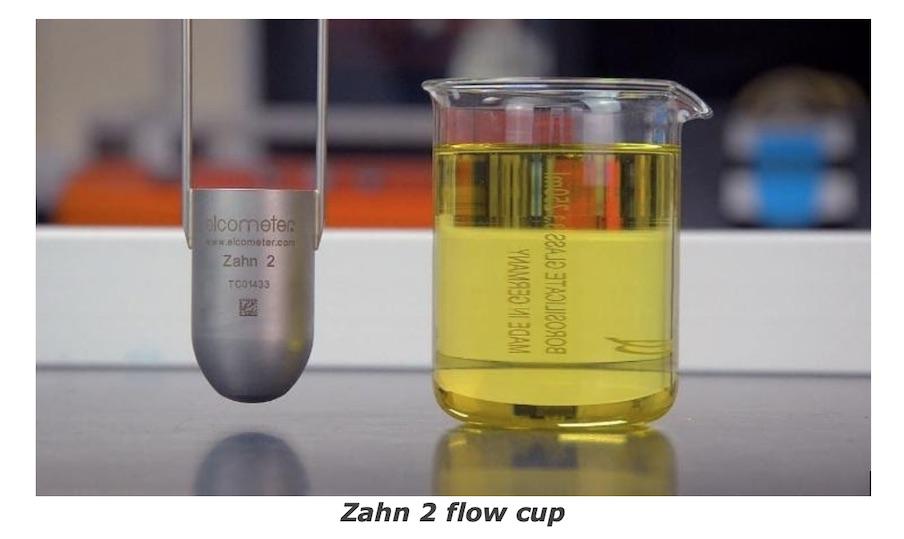 Der schnellste und einfachste Weg, um die Viskosität eines Schutzlacks zu überprüfen, ist die Verwendung eines Fließbechers, einem einfachen Werkzeug aus Edelstahl mit einem Loch in der Mitte des Bodens. Es ermöglicht die Messung der kinematischen Viskosität eines Materials, ausgedrückt in Sekunden Fließzeit. Es gibt verschiedene Bechertypen auf dem Markt. Wenn wir zum Beispiel unser weitverbreitetes Acrylmaterial auf Lösungsmittelbasis, ABchimie AVR80 BA DS 65 messen, empfehlen wir die Verwendung eines Zahn 2-Bechertyps.