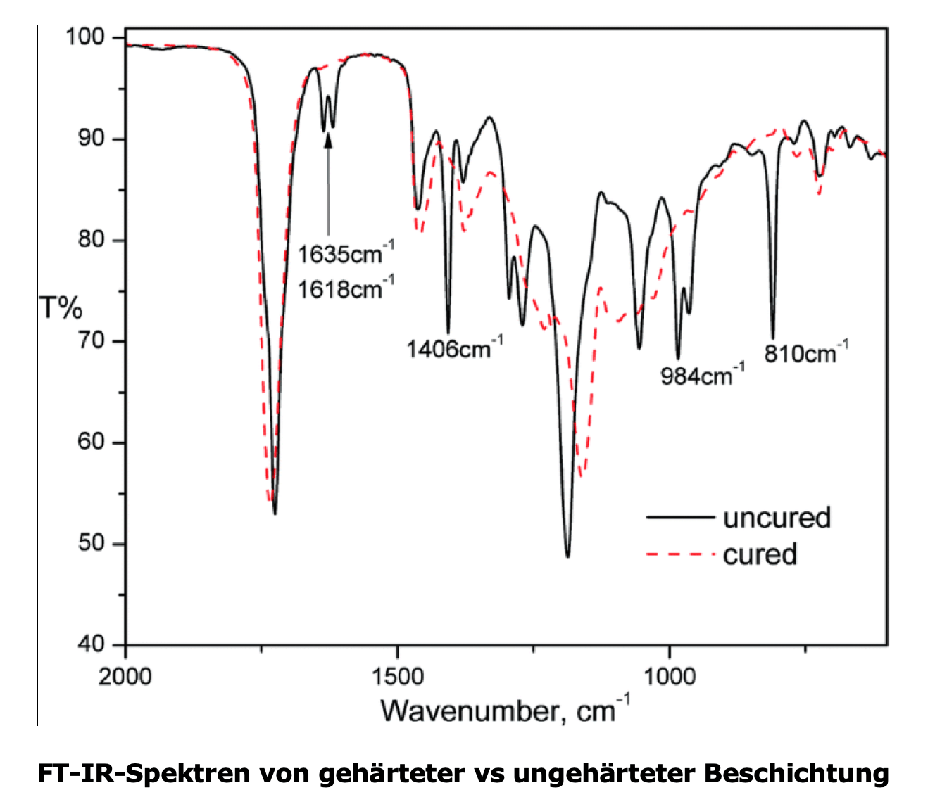 Zum Beispiel würden wir für die lösungsmittelbasierte Acrylchemie ausschließlich das Verschwinden von Lösungsmittelfunktionalitäten untersucht, da der Härtungsprozess einfach auf der Verdampfung des Lösungsmittels beruht. Für die lösungsmittelfreie UV-Licht härtbare Chemie, würden wir die Doppelbindungskonversation und das Verschwinden von Isocyanatpeaks betrachten, da der Härtungsprozess einen komplexeren Doppelhärtungsprozess mit UV-Lichthärtung und sekundärer Feuchtigkeitshärtung umfasst.
