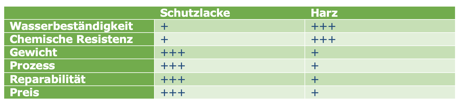 Mit einem Verguss können Ihre Baugruppen vor Regen und / oder längerem Eintauchen geschützt werden. Hier ist eine Übersichtstabelle, die Ihnen bei der Auswahl zwischen einer Schutzbeschichtung oder einem Verguss helfen kann.