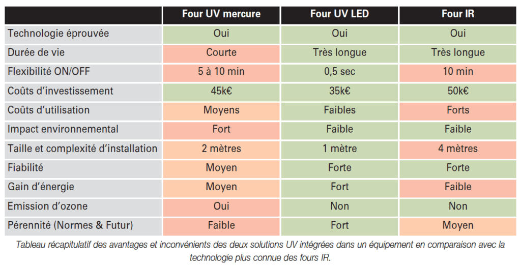 La puissance d’une lampe mercure décroit dans le temps en fonction de son utilisation, cela implique qu’il faut régulièrement contrôler sa puissance pour être sûr que la dose en millijoules est suffisante pour assurer une polymérisation correcte. C’est une contrainte à prendre en compte dans le choix de la technologie. Le prix d’une lampe mercure est plutôt attractif (quelques centaines d’euros), mais ce système nécessite beaucoup de maintenance et l’industriel doit avoir à l’esprit qu’il faut remplacer les lampes assez fréquemment. Il faut aussi tenir compte des normes REACH et autres normes environnementales qui ne prévoient pas de pérenniser cette technologie. De plus, l’intégration d’une lampe mercure dans un équipement nécessite un système d’extraction et une gestion de la température qui peut être vite contraignante.