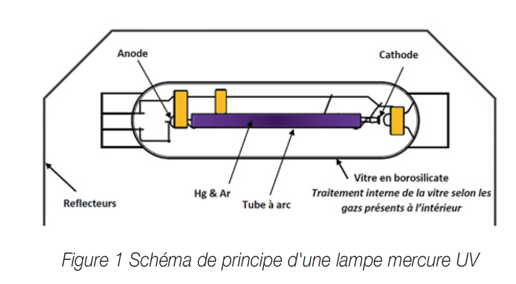 Le principe de fonctionnement est le suivant : un courant va traverser les gaz présents dans le tube à arc, et par ionisation des photons (de la lumière) vont être émis. La longueur d’onde (la/les couleur(s)) émises va dépendre des gaz présents dans la lampe. Le mercure est souvent présent sous forme de « petites billes » et en chauffant vont se retrouver à l’état de gaz pour se mélanger avec l’autre gaz inerte présent dans le tube. Il existe aussi des lampes dopées au fer ou au gallium. Ceci dépend des longueurs d’ondes et du spectre de lumière qu’on souhaite obtenir. Par exemple, le spectre d’une lampe dopée gallium se rapproche du spectre d’une lampe UV LED (vers les 400nm).