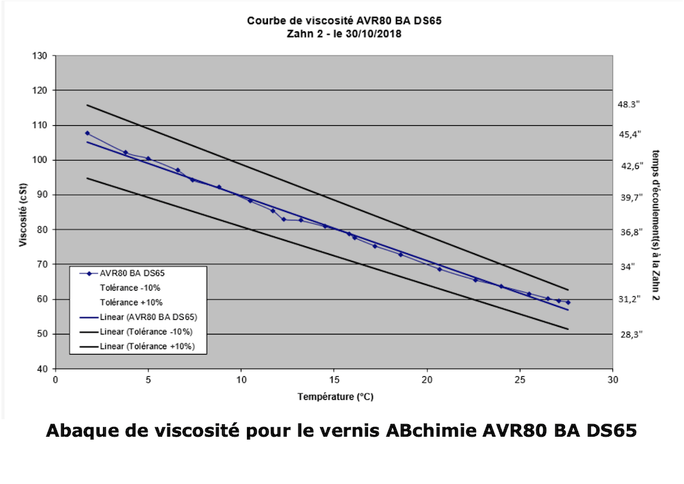 La façon la plus rapide et la plus simple de vérifier la viscosité d’un vernis est d’utiliser une coupe qui est un outil simple en acier inoxydable avec un trou percé au centre. Il permet de mesurer une viscosité cinématique, qui est un temps d’écoulement exprimé en secondes. Il y a plusieurs types de coupes disponibles sur le marché. Si nous prenons par exemple notre vernis acrylique solvanté, ABchimie AVR80 BA DS 65, nous vous recommandons d’utiliser une coupe Zahn 2.