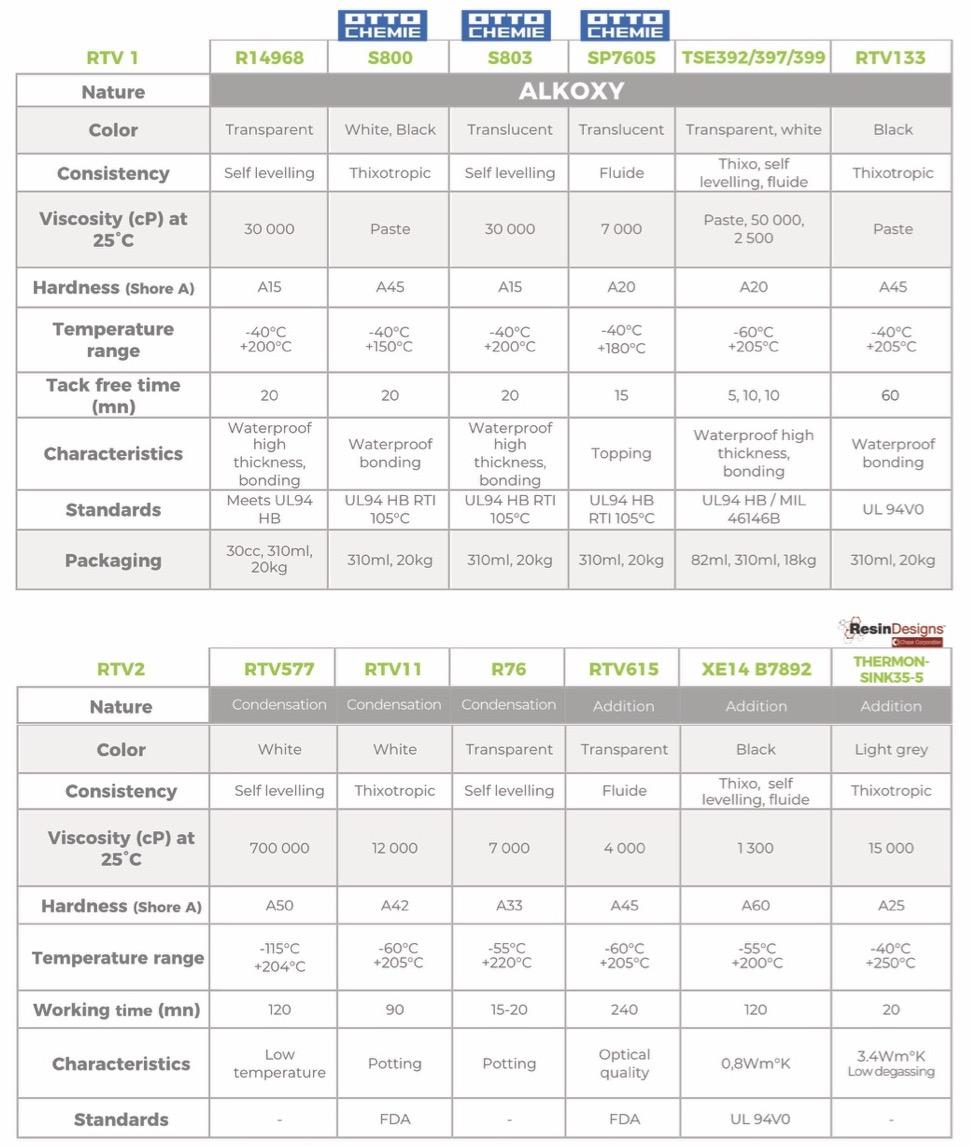RTV Silicones are used in a wide of applications for bonding components, and sealing against moisture or environmental contaminants. A large offer of 1 Part and 2 Part Adhesives and Sealants, many silicone are excellent candidates for assembly applications for sensitive electrical and electronic components. These materials are applied by a variety of methods ranging from manual dispensing to auto-dispensing units with tube, cartridge, pail, or drum packages. Mix of 2 part grades may be accomplished by either manual processes or meter mix dispensing, depending on production volume and post-mix material properties.