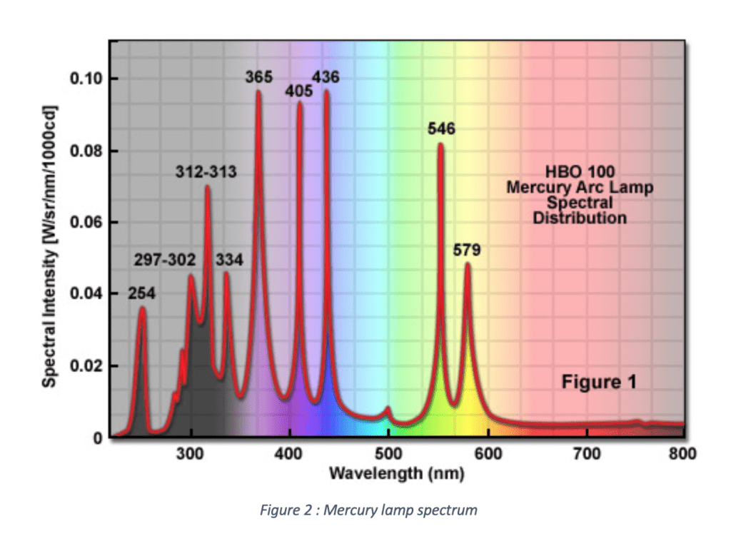 The operating principle is the following: a current pass through the gases in the arc tube, and by ionizing the photons then light will be emitted. The wavelength will depend on the gases present in the lamp. Mercury is often present in the form of “small beads” and when heated will end up in the gas state to mix with the other inert gas present in the tube. There are also lamps doped with iron or gallium. This depends on the wavelengths and the spectrum of light you want to get. For example, the spectrum of a gallium doped lamp is close to the spectrum of a UV LED lamp (around 400nm).
