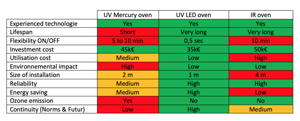 The power of a mercury lamp decreases over time depending on its use, which means that it must regularly control its power to be sure that the dose in millijoules is sufficient to ensure correct and sufficient curing. This is a constraint to be considered in the choice of a technology.