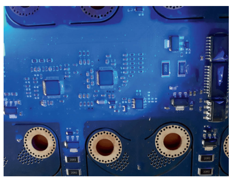 First, it was related to the shadow areas on some PCBs where the coating can penetrate but not receive any UV light, limiting its polymerization.
