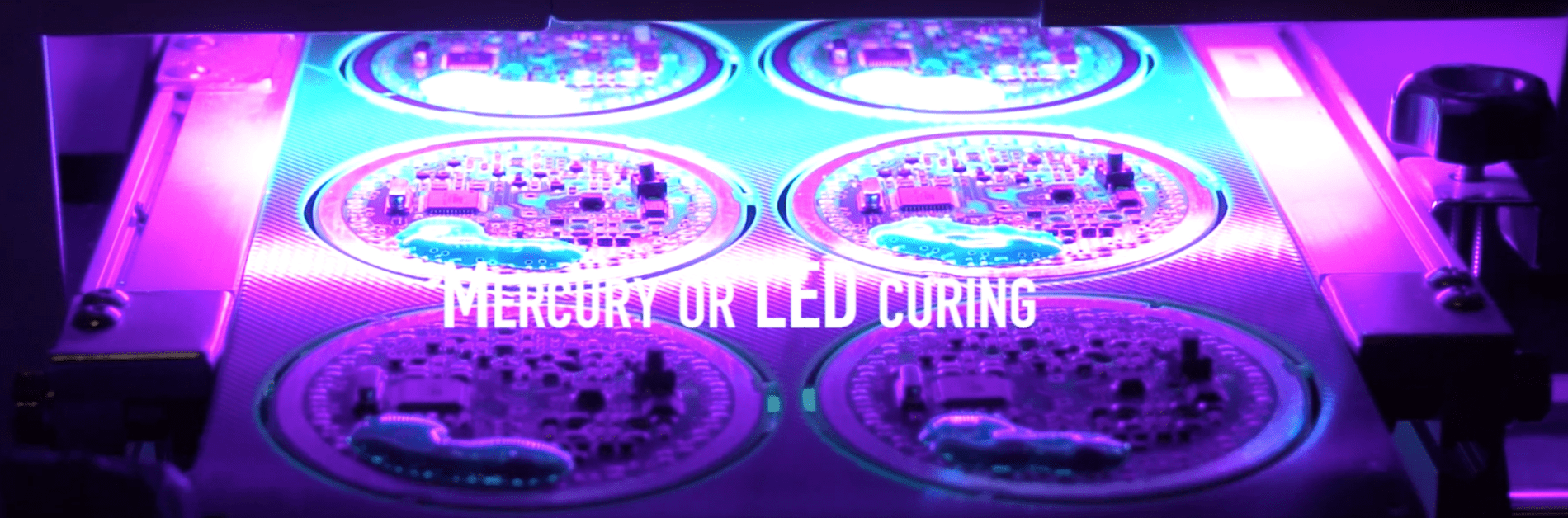 In fact the UV dose inhibits the photoiniators included in the formulation, which immediately enables the quick curing. This technology is well known in other industries that manufacture inks such as the stereolithographic industry, tooth composites etc. The major challenge in the electronics area is depositing the thickness necessary to efficiently protect the PCB and the shadows area. Most dispensing machines deposit an average thickness of 100 microns using a film coater, even if the UV conformal coating itself is already effective at a thickness of 30 microns.