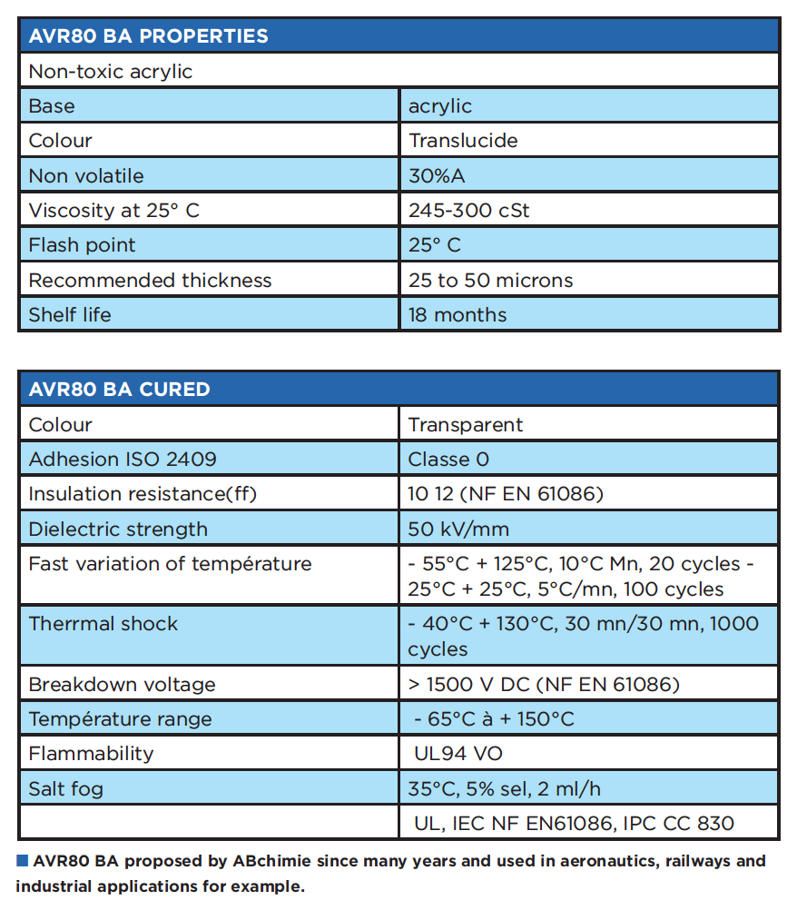 For eight years now ABchimie has proposed AVR80 BA as a non toxic acrylic conformal coating which provides very high protection and respects the environment and the operator. AVR80 BA is now very well known and used by many users, such as Alstom, Schneider, Sagem, Renault, Volvo, Faiveley, SEB, Zodiac, Airbus…on different applications.