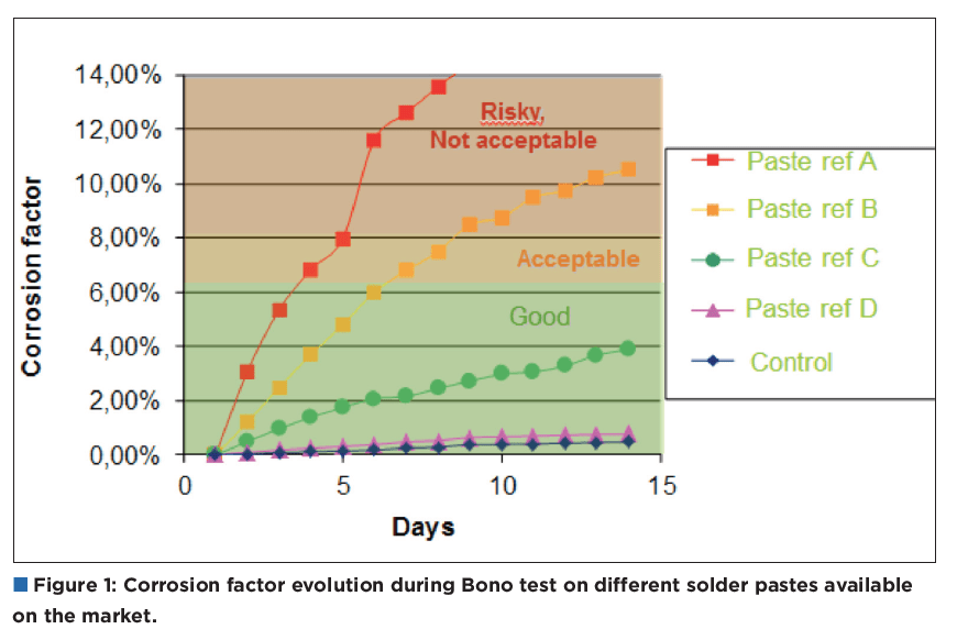As this test is very selective it may gives you a clear view of the relative corrosive performance of different solder products. With experience you may decide a threshold value for the corrosion factor calculated (Fig1). Thus the Bono test is a key element in the Board assembler’s quality assessment kit.