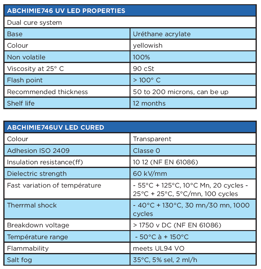 ABchimie746UV LED is the latest innovative system, which is a soft version of the ABchimie526UV LED. ABchimie746UV LED cures at the usual thickness (around 100 microns) but may also cure at 2mm, it means that in cases of high thickness deposits flowing around the bottom of components, you will not have cracking or delamination. It offers a very good resistance in thermal shocking and provides exceptional adhesion on the PCB.